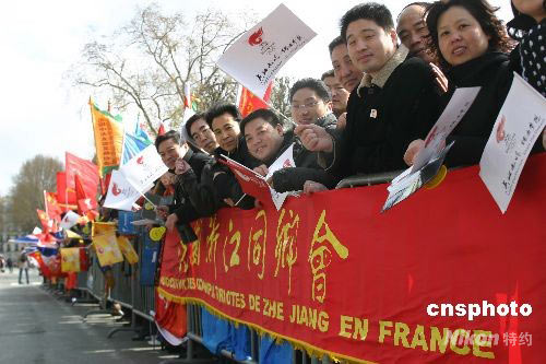 法國(guó)當(dāng)?shù)貢r(shí)間4月7日中午,北京奧運(yùn)圣火在“浪漫之都”巴黎傳遞在巴黎的地標(biāo)埃菲爾鐵塔拉開(kāi)帷幕。圖為法國(guó)巴黎當(dāng)?shù)厝A人華僑在埃菲爾鐵塔下迎接奧運(yùn)圣火。 沈晨 攝