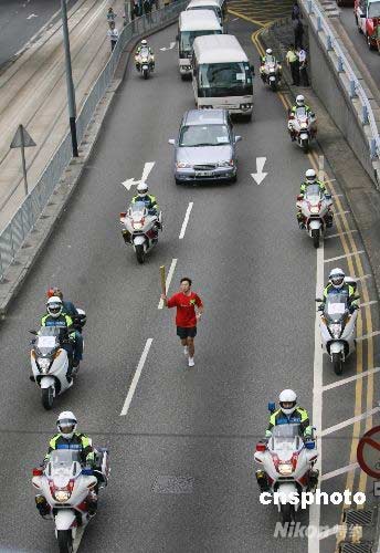 四月十八日,香港舉行北京奧運火炬接力測試,以確保五月二日的傳遞活動順利舉行。圖為模擬火炬手通過中環的中銀大廈前。中新社發 武仲林 攝