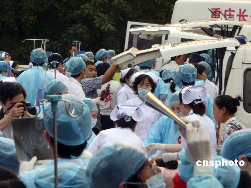 5月19日下午五點半多,四川汶川地震災區的一批重傷員抵達重慶,重醫附一院的醫生護士象解放軍野戰醫院搶救傷員一樣投入搶救,猶如前方的戰場。