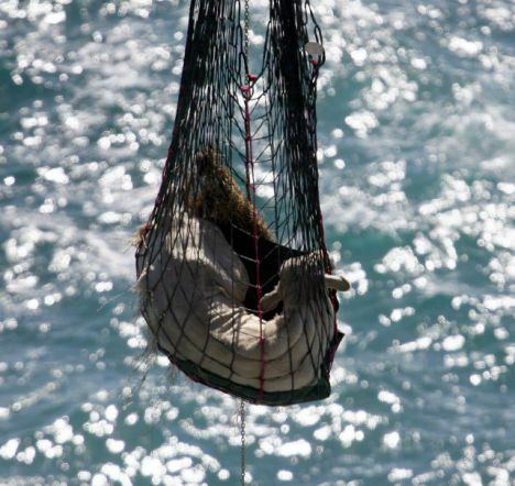 皇家海軍直升機將裝在網(wǎng)里的公牛運出懸崖,將它送回牛群。