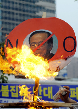 與來(lái)自民間的反對(duì)聲浪相比,韓國(guó)政府十天里也動(dòng)作頻頻。除14日當(dāng)天李明博通過(guò)發(fā)言人“深表遺憾”,并指示政府“嚴(yán)正對(duì)待”外,韓國(guó)外交部立即召見(jiàn)日本駐韓大使要求其“糾錯(cuò)”,并命令韓駐日大使迅速回國(guó)。韓國(guó)教育科技部也向日本文部科學(xué)省發(fā)去了抗議書(shū)。韓國(guó)各地方政府則陸續(xù)中斷了同日本的交流。