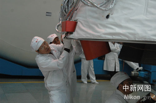 中國神舟七號載人航天飛船發射在即。圖為飛船推進艙測試。