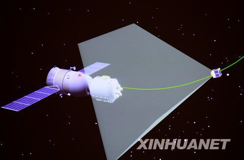 9月27日,在完成航天員出艙任務后,神舟七號飛船在太空釋放一顆伴飛小衛星(攝于北京航天飛行控制中心大屏幕)。新華社記者 查春明 攝