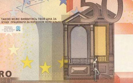 這套樣鈔分別面值5歐元、10歐元和50歐元,雖然屬于正常渠道發行,但是不能流通。與真幣的差別在于,這些鈔票的背面圖案上均添加了一個僅身著內衣的妓女形象,搔首弄姿的倚靠在歐洲一些著名的建筑物旁。樣鈔背面左上方的位置還寫有一句警示語,警告那些想通過非法途徑來歐盟國家務工的人要考慮清楚為此付出的代價。由于添加的圖案較小,隱藏在傳統歐元鈔票的圖案中,因此如果不是仔細分辨,樣鈔足以以假亂真。