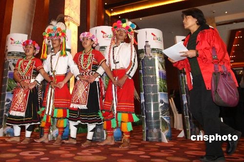 圖為來自臺(tái)灣的原住民在會(huì)場(chǎng)外載歌載舞歡迎賓客。