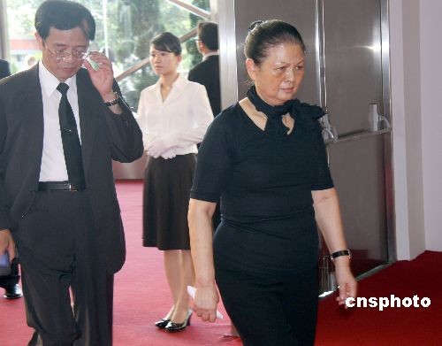 臺塑企業創辦人王永慶的遺體十七日由長榮班機運抵臺灣,靈堂設在桃園縣的長庚大學活動中心。圖為王永慶的夫人李寶珠步入靈堂。中新社發 耿軍 攝