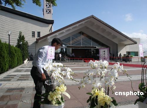 臺塑企業創辦人王永慶的遺體十七日由長榮班機運抵臺灣,靈堂設在桃園縣的長庚大學活動中心。圖為靈堂外景。中新社發 耿軍 攝