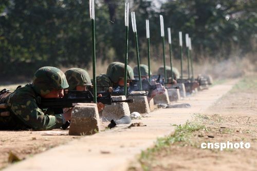 偵察隊(duì)員一線(xiàn)展開(kāi)進(jìn)行射擊。中新社發(fā) 崔成俊 攝