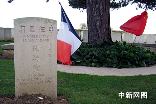 據了解,第一次世界大戰期間,約十四萬中國勞工遠渡重洋來到歐洲前線。他們主要集中在法國北部從事戰地后勤的工作,如維修道路、營房,挖掘戰壕,裝卸彈藥,救護傷員,掩埋尸體等。一九一七年八月,中國政府正式對德宣戰后,部分華工加入法軍,直接參加戰斗。一九一八年九月至十一月,德國等同盟國先后戰敗投降,華工為中國爭得戰勝國地位立下汗馬功勞,但同時也付出了沉重代價:中國勞工中有兩萬人再也沒能踏上故鄉的土地,這些客死他鄉的中國勞工大部分安葬在法國北部諾萊特等墓園中,每個人的墓碑上都刻有中文的銘文。
