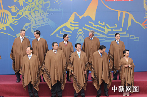 為期兩天的亞太經合組織第十六次領導人非正式會議,二十三日在秘魯首都利馬結束。圖為各成員領導人在會后身著南美披風合影。齊彬攝