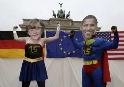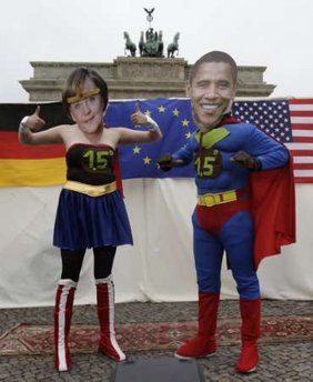 中新網(wǎng)6月26日電 據(jù)星島環(huán)球網(wǎng)報(bào)道,德國一個(gè)氣候活動(dòng)組織25日在柏林勃蘭登堡門前抗議。他們扮成德國總理默克爾和美國總統(tǒng)奧巴馬的模樣,穿上超人服裝,呼吁默克爾在氣候問題上與奧巴馬商談時(shí)要維護(hù)此前“歐盟氣候超人”的地位。