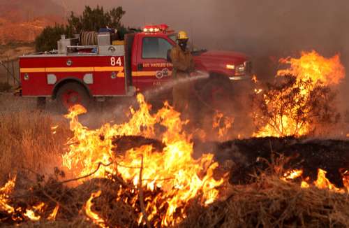 由于持續(xù)高溫干熱,從上周開始,洛杉磯北部山區(qū)接連爆發(fā)山火,盡管數(shù)千名消防員和滅火飛機(jī)奮力撲火,但火勢(shì)迅速蔓延,至今主要火區(qū)的山火只有百分之五得到控制。記者看到,山火引發(fā)的濃煙彌漫在洛杉磯北部上空,東西長(zhǎng)達(dá)十幾公里,蘑菇狀濃煙高聳入云。
