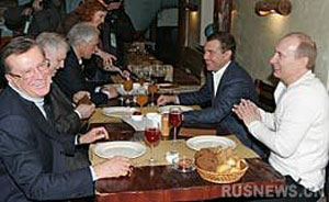 當(dāng)他們五個(gè)人在名為“遠(yuǎn)征”的飯店就座后,普京向擔(dān)任國(guó)家公職前曾多次參加地質(zhì)考察的米羅諾夫詢問(wèn)道:“您去過(guò)‘考察’多少年?”(在俄文中,“考察”和“遠(yuǎn)征”是同一個(gè)詞)。普京借此開(kāi)玩笑建議聽(tīng)取米羅諾夫的點(diǎn)菜經(jīng)驗(yàn)。在眾人的笑聲中米羅諾夫回答到:“18年。現(xiàn)在就開(kāi)始第19個(gè)年頭了。”