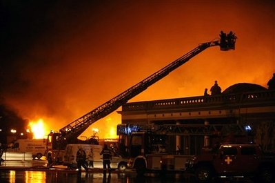 中新網10月17日電 綜合報道,捷克首都布拉格的百年建筑工業宮16日失火,其左翼付之一炬。