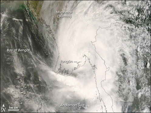 美國(guó)“今日宇宙”(universetoday)網(wǎng)站公布的衛(wèi)星照片顯示,強(qiáng)熱帶風(fēng)暴“納爾吉斯”2日開(kāi)始在緬甸伊洛瓦底省海基島附近登陸,風(fēng)暴登陸時(shí)的最大風(fēng)力超過(guò)190公里。風(fēng)暴登陸后轉(zhuǎn)向緬甸三角洲地區(qū),一路掃蕩伊洛瓦底省、勃固省和仰光省,3日凌晨突然抵達(dá)仰光市中心。屬于第三級(jí)熱帶氣旋的“納爾吉斯”一路沿仰光西南約220公里的伊江江口登陸北上,沿途摧毀無(wú)數(shù)的建筑物。
