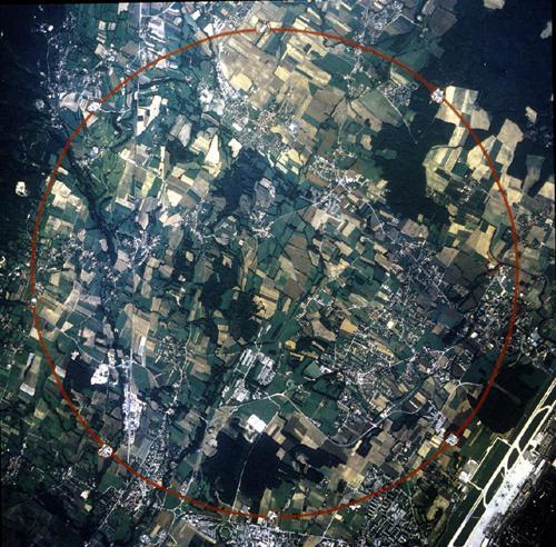 大型強子對撞機是世界最大的粒子加速器,建于瑞士和法國邊境地區地下一百米深處的環形隧道中,隧道全長二十六點六五九公里。對撞機開足馬力后,能把數以百萬計的粒子加速至將近每秒鐘三十萬公里,相當于光速的百分之九十九點九九。粒子流每秒可在隧道內運行一萬一千二百四十五圈,單束粒子流能量可達七萬億電子伏特。