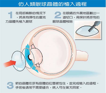 目前也有其它種人工制成的塑料眼球晶體在臨床上使用,不過因彈性不足,只能解決近視或遠視其中一種毛病,更談不上根治老花眼。