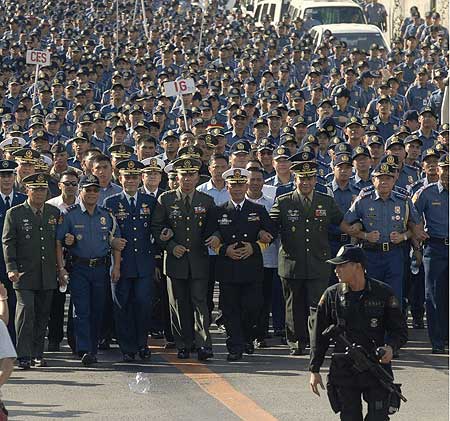 菲律賓數(shù)萬人示威游行 軍警手挽手力挺總統(tǒng)(圖)