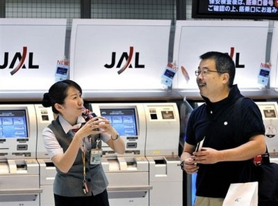 日航機場共人員為滯留乘客辦理手續。