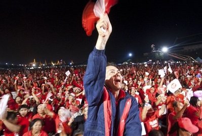 抗議群眾阻斷在泰國首都國會大廈前的道路,圍住國會入口,誓言將留守直到阿披實辭職。
