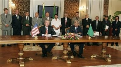 美國助理國務卿韋爾奇(前排左)與利比亞外交部美洲事務負責人費圖里(前排右)在協議上簽字。