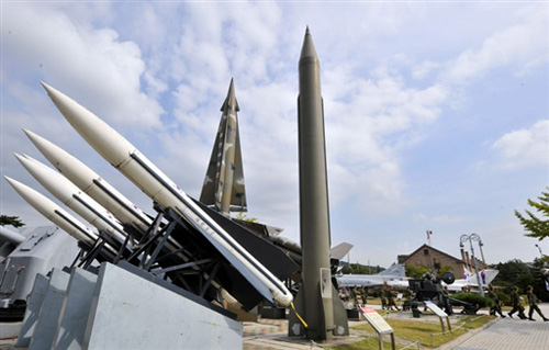 10月8日,韓國軍人在朝鮮戰爭紀念館展示的朝鮮導彈模型前走過。韓國媒體報道稱朝鮮7日發射了短程導彈。