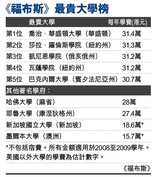 中新網2月10日電 全球經濟衰退,大學要獲得資金也變得困難,學費自然要加價!陡2妓埂冯s志列出學費最貴的大學名單,美國排名首5位,這些大學于2007至2008年學費加價4.8%。另外,新加坡國立大學(NUS)躋身美國以外的最貴大學排名榜中。