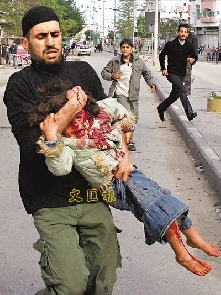空襲繼續造成平民傷亡,一名巴人抱著滿面鮮血的女孩逃亡。