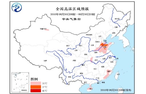 中新網6月30日電 據中國氣象局網站消息,中央氣象臺今日6時繼續發布高溫藍色預警,預計,今天白天,黑龍江、山西等地的高溫天氣將暫時告一段落,河北南部、河南東部和北部、山東大部、安徽北部、江蘇西北部、湖北西部、福建中南部的部分地區、廣東東部、海南北部等地將會出現35~37℃的高溫。另外,預計未來幾天,中國主要降雨帶將明顯北抬。