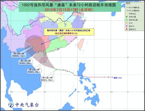 預計,“康森”將以每小時15-20公里的速度向西偏北方向移動,強度還將有所增強,有可能發展為臺風,將于16日中午到夜間在海南文昌到三亞一帶沿海登陸。