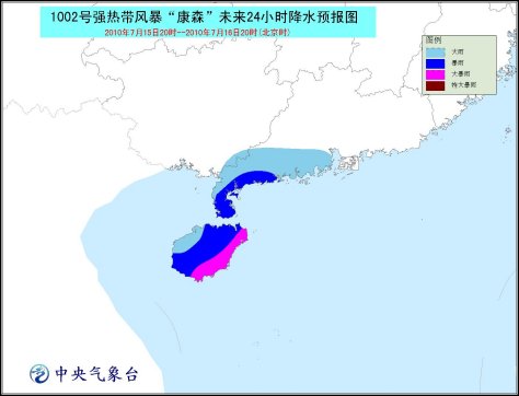 受其影響,15日晚上到16日白天,南海北部和中部、海南省及其沿海、瓊州海峽、廣東西部沿海、北部灣東部海面將有7-9級大風,“康森”中心經過的附近海面或地區的風力可達10-12級;海南、廣東西南部將有大到暴雨,其中海南東部的部分地區有大暴雨,局地有特大暴雨。