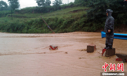 圖為一名煤礦保安在沖毀的路段指揮交通。季小燕 攝