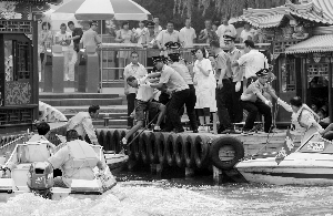 昨天,頤和園舉行了水上救生演練,“游客”昆明湖落水,救援船只在3分鐘內(nèi)趕到救援(見圖)。此外,昆明湖水上還舉行了模擬游船失火、游客被困以及船上發(fā)現(xiàn)爆炸品的應(yīng)急演練。