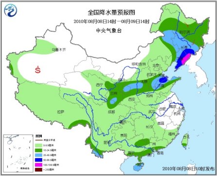 8日08時至9日08時,新疆天山地區和南疆西部、西藏大部、青海東北部和南部、西北地區中東部、內蒙古中東部、東北、華北、黃淮大部、江淮西部、江漢、江南中西部、華南大部、西南以及臺灣等地有小到中雨或陣雨,其中,黑龍江南部、吉林大部、遼寧大部、河北中南部和東部、北京東部、天津、山東北部以及內蒙古東部的部分地區、海南大部、臺灣南部等地有大雨或暴雨,吉林東南部、遼寧中東部等地的局地還將有大暴雨;上述部分地區并伴有短時雷雨大風等強對流天氣。內蒙古中東部、東北西部等地有4~6級風。黃海、東海、臺灣海峽將有5~8級風。