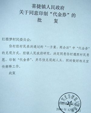 那么,村委會私自印制發行代金券的行為是否合法呢?面對記者的追問,三位村官都以沉默作答。再三追問之下,他們出示了當地鎮政府對此做過的批示。批示上蓋有宜賓縣喜捷鎮人民政府的公章。批復中寫道,經鎮人民政府研究,決定同意你村印制代金券。