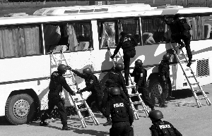一輛旅游大巴車被“歹徒”“劫持”,一輛警用裝甲車突然頂住客車的車頭,迫使客車停止行駛。特警三人一組,破窗進(jìn)入客車,幾秒鐘后,數(shù)名“歹徒”先后被控制住。昨日,北京公安特警和武警首次舉行反恐處突綜合實戰(zhàn)演練,向中外媒體、在京駐華使館安全官和警務(wù)聯(lián)絡(luò)官展示北京警方反恐能力。
