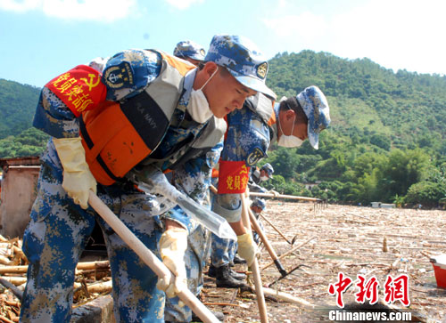 中新網高州9月26日電 (肖德倫 徐苗波)南海艦隊某陸戰旅在25日派出175名官兵、40輛工程車輛的基礎上,今天又增派200名陸戰隊員,緊急奔赴100多公里趕赴茂名市搶險救災。