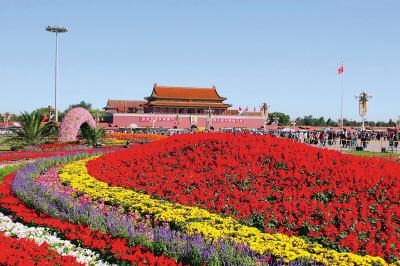 今年“十一”是共和國61歲生日,北京天安門廣場被鮮花裝扮得五彩繽紛,呈現一派節日氣氛。
