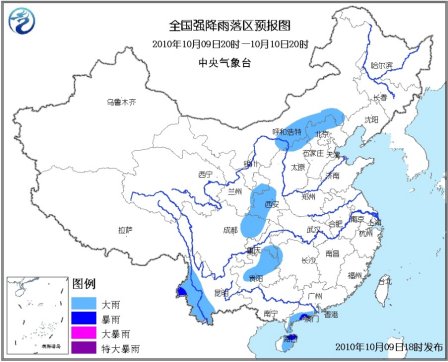 10月9日20時到10日20時,廣東西南部、海南中東部、云南西部、四川東北部、重慶東南部、貴州東北部、甘肅東部、陜西西南部、山西北部、河北西北部、內蒙古中部偏南地區等地有大雨,其中,云南西部、海南東部、廣東西南部等地的部分地區有暴雨。上述地區局部伴有短時雷雨大風等強對流天氣。