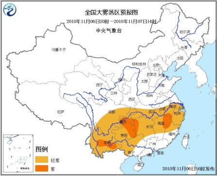 6日夜間到7日上午,湖北中南部、蘇皖南部、江南大部、西南地區東部和南部、廣西中西部等地有輕霧,其中,貴州北部和東部、重慶南部、湖南西部、江西東北部、福建西北部、安徽南部、云南中部等地的部分地區有能見度不足1000米的霧,局部地區能見度不足500米。