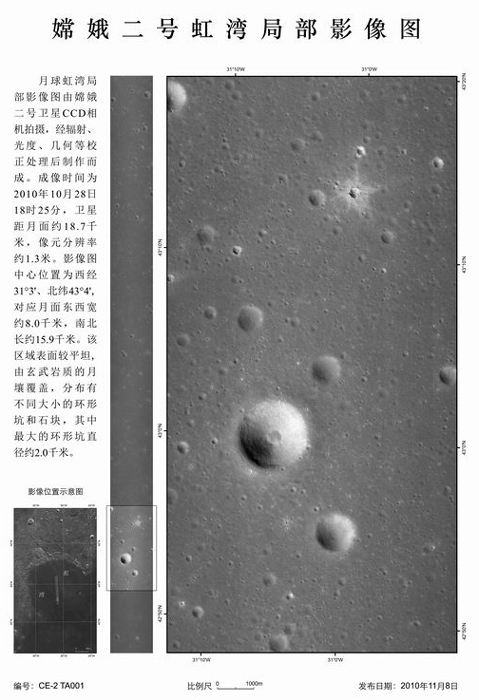 據(jù)中央電視臺報道,首次公布的月球虹灣地區(qū)局部影像圖是一張黑白照片。據(jù)國防科技工業(yè)局有關(guān)負(fù)責(zé)人介紹,該影像成像時間為10月28日18時,是衛(wèi)星距離月面大約18.7公里地方拍攝獲取。影像圖的傳回,標(biāo)志著嫦娥二號任務(wù)所確定的六個工程目標(biāo)已經(jīng)全部實現(xiàn)。這意味著探月工程二期“嫦娥二號”工程任務(wù)取得圓滿成功。