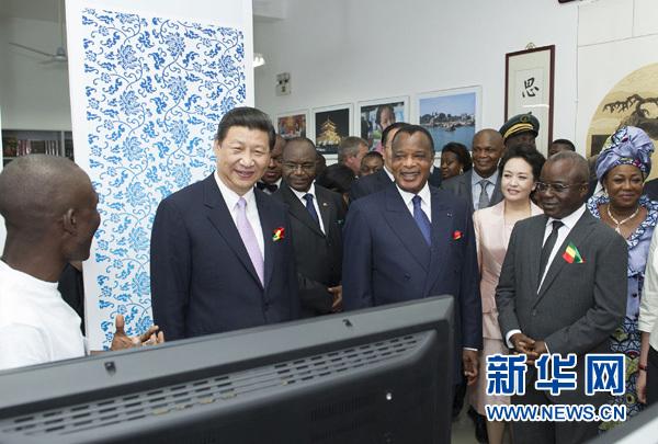 習近平和薩蘇共同為圖書館剪彩。隨后,兩國元首步入圖書館大廳,一同為圖書館和中國館揭牌。剛果高教部長莫揚代表師生發表講話,感謝中國為改善剛果教學條件提供的幫助。