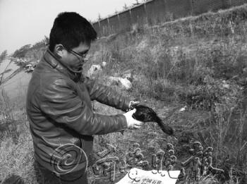 張世平在岸邊的礁石下找到了一只渾身沾滿油污的黑頸,這只鳥的野性很強,看到有人靠近,不停地撲騰翅膀,不讓志愿者抓他。志愿者“偷襲”成功后,將它放進袋子里準備帶回去清洗。記者看到,這只鳥全身上下除了喙外均是黑色,渾身是血。張世平告訴記者,因為羽毛沾滿油污后,鳥感覺非常不舒服,便用喙不停地啄羽毛,用勁過大導致出血。