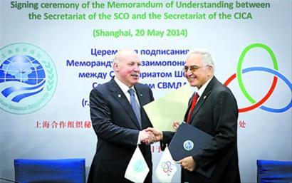 5月20日,亞洲相互協作與信任措施會議秘書處與上海合作組織秘書處在亞信第四次峰會新聞中心舉行簽署諒解備忘錄儀式。 竺鋼 攝