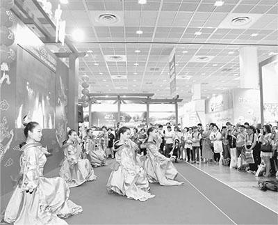 中韓兩國一衣帶水,文化交往源遠(yuǎn)流長(zhǎng)。圖為不久前在首爾舉行的第二十九屆韓國國際旅游展上,韓國參觀者觀看中國展臺(tái)的舞蹈表演。