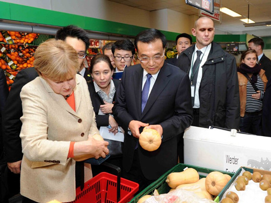 在默克爾的總理府檢閱完儀仗隊(duì),在紅地毯的盡頭,默克爾微微笑,抬起右前臂,伸出大拇指——這是對(duì)李克強(qiáng)的一個(gè)贊賞?這個(gè)小動(dòng)作饒有趣味。在默克爾領(lǐng)李克強(qiáng)去她經(jīng)常逛的一個(gè)超市,李克強(qiáng)要去拿提籃,默克爾擺手制止了他,她自己熟練地拎上提籃,自然而然引領(lǐng)著李克強(qiáng)走上自己熟悉的逛超市線路。很顯然,無(wú)論你是否在意他們的職務(wù),他們之間的關(guān)系是老熟人,是朋友。國(guó)與國(guó)之交往,私人之間的友誼,正是象征,不可忽略。