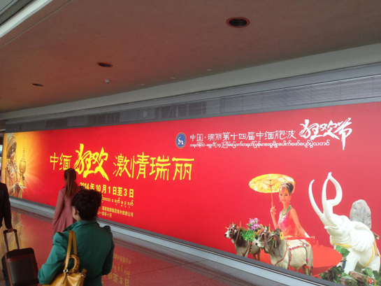 11月10日,記者在昆明長水國際機場轉機前往緬甸時在機場拍下的中緬胞波狂歡節宣傳廣告。(新華社記者 桂濤攝)