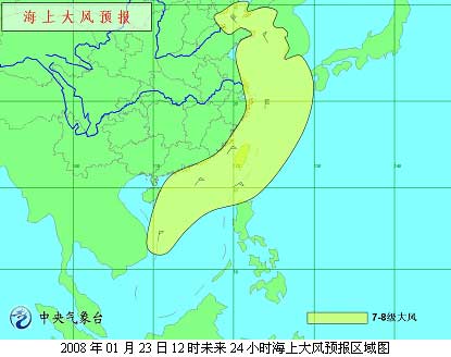 中新網1月23日電 中央氣象臺今天上午發布海上大風預報,稱中國東部和南部海域將有7-8級大風,提醒上述海域航行、作業的船舶和人員應回港避風,注意航行安全。