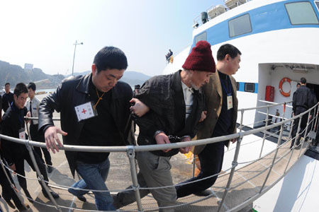 接下來(lái)的一切,是雙向遣返任務(wù)中的“常規(guī)動(dòng)作”:確認(rèn)王志華身份無(wú)誤后,臺(tái)灣執(zhí)法人員把他移交給大陸有關(guān)人員。頭戴帽子、胡子花白的王志華卸下了臺(tái)灣的手銬腳鐐,換上了大陸的手銬,在一前一后兩個(gè)佩戴紅十字會(huì)證件的工作人員押帶下登上扶梯進(jìn)入“海峽”號(hào)。