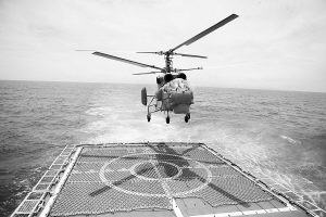 反潛直升機離艦搜索目標。 本報記者 孫陽攝